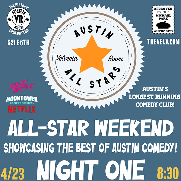 The Austin comedy scene is booming - and The Velv has been at its center for over 38 years. We're celebrating All-Star Weekend with the best this town has to offer, featuring comics from SXSW, Moontower Comedy Festival, and more! We've got 5 shows with 5 different lineups - all hits, no skips! If you've wanted to check out the Austin scene, you can't go wrong with any of these shows!